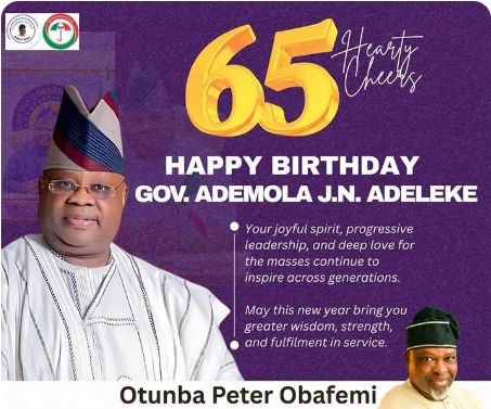 Peoples Democratic Party (PDP) chieftain and governorship aspirant for the Ekiti 2026 governorship election, Otunba Olugbenga Peter Obafemi(OPO) stated this in a congratulatory message titled: “Ijaya Osun APC @65, I salute Governor Ademola Adeleke,” signed by Otunba Obafemi.