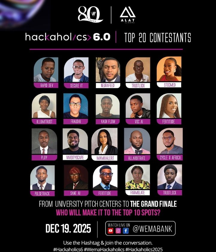 Following the 2-day pre-pitch for the grand finale, Wema Bank, Nigeria’s leading innovative bank and pioneer of Africa’s first fully digital bank, ALAT, has announced the Top 20 finalists for Hackaholics 6.0. The 2-day pre-pitch took place on December 16 and 17, 2025.